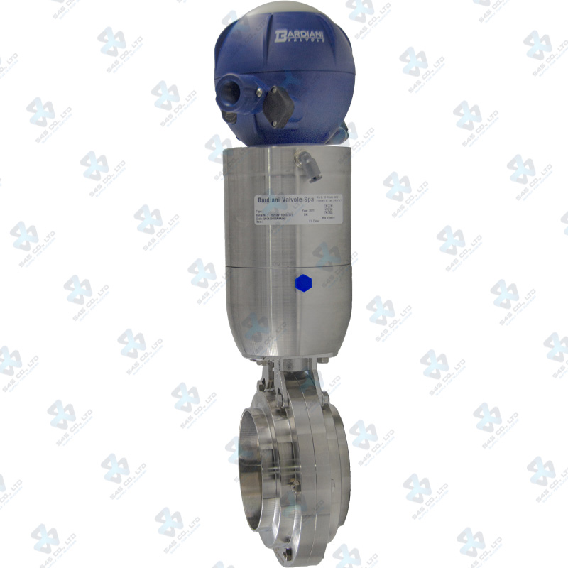 Van bướm vi sinh Đóng mở khí nén ; ZVF ; Mach98 lò xo tự hồi NC/NO ; Inox 316L/EPDM ; SMS ; 4Inch (OD101.6mm) ; Nối hàn ; Bardiani Bao gồm J-Giotto 1EV 24VDC 1PNP PG11 Led Board