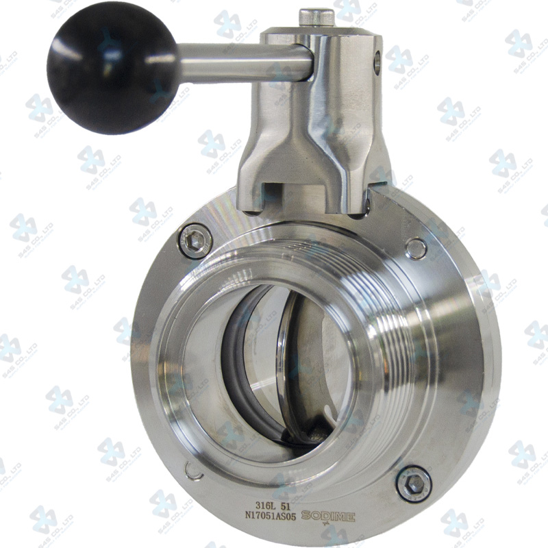 Van bướm vi sinh Đóng mở tay ; Tay K5 2 vị trí ; Inox 316L/EPDM ; SMS ; 2Inch (OD51mm) ; Nối rắc co ; Sodime
