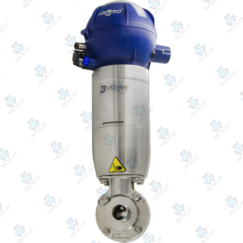 Van bướm vi sinh Đóng mở khí nén ; ZVF ; Mach83 lò xo tự hồi NC/NO ; Inox 316L/FKM/VITON ; SMS ; 1Inch (OD25mm) ; Nối hàn ; Bardiani Bao gồm J-Giotto 1EV 24VDC 2PNP PG11 Led Board