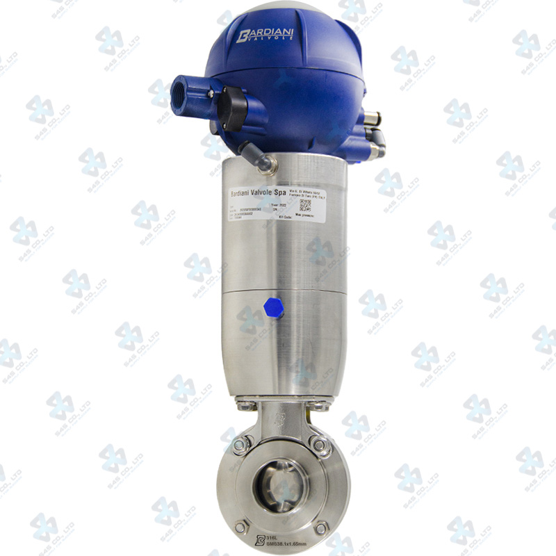 Van bướm vi sinh Đóng mở khí nén ; ZVF ; Mach83 lò xo tự hồi NC/NO ; Inox 316L/FKM/VITON ; ASME BPE ; 1.5Inch (OD38.1x1.65mm) ; Nối cùm ; Bardiani Bao gồm J-Giotto 1EV 24VDC 1PNP PG11 Led Board