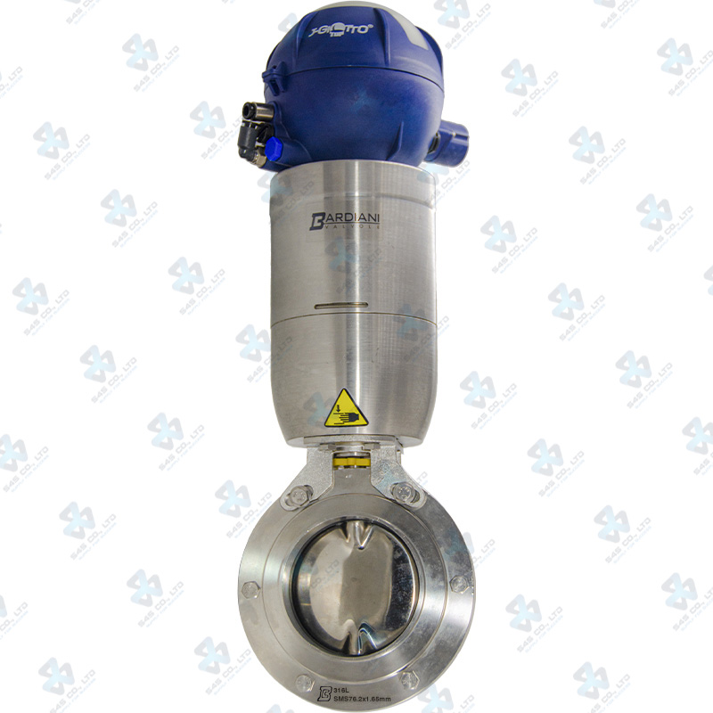 Van bướm vi sinh Đóng mở khí nén ; ZVF ; Mach98 tác động kép ; Inox 316L/SILICONE ; ASME BPE ; 3Inch (OD76.2x1.65mm) ; Nối hàn ; Bardiani Bao gồm J-Giotto 2EV 24VDC 1PNP PG11 Led Board