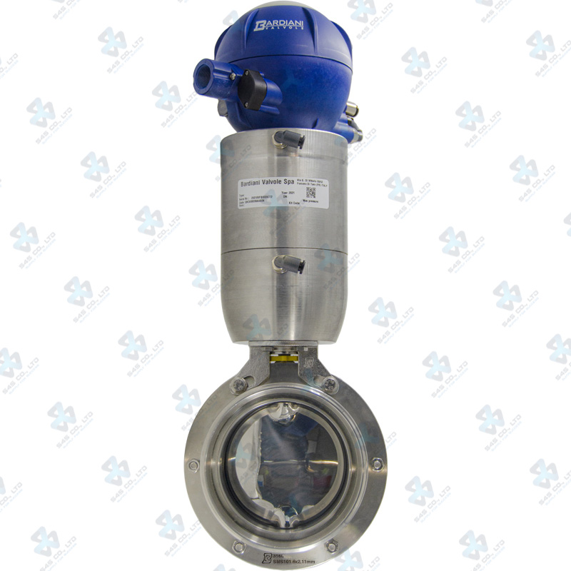 Van bướm vi sinh Đóng mở khí nén ; ZVF ; Mach98 tác động kép ; Inox 316L/SILICONE ; DIN11864-1 ; 4Inch (OD101.6x2.11mm) ; Nối hàn-rắc co ; Bardiani Bao gồm J-Giotto 2EV 24VDC 2PNP PG11 Led Board
