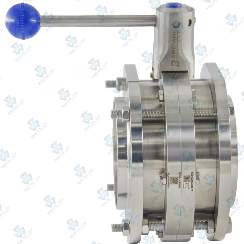 Van bướm vi sinh Đóng mở tay ; VVF ; WAF4 ; Tay rút 76-104 3/4 vị trí ; Inox 316L/SILICONE ; SMS ; 4Inch (OD101.6mm) ; Nối hàn ; Bardiani